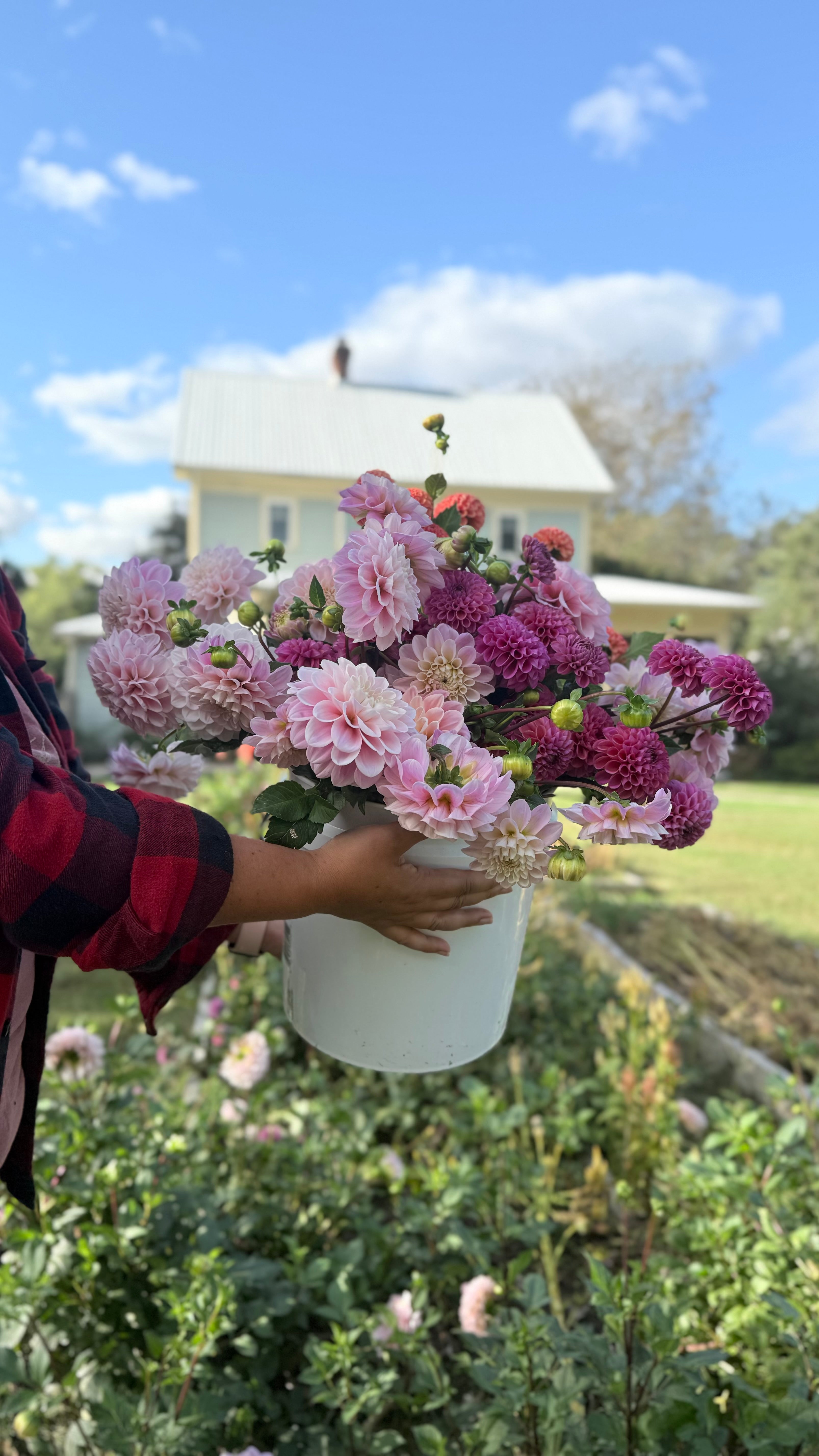 What you get A 3-gallon bucket of seasonal blooms picked by us filled with all the best looking flowers and fillers in our field with your specific color palette in mind.